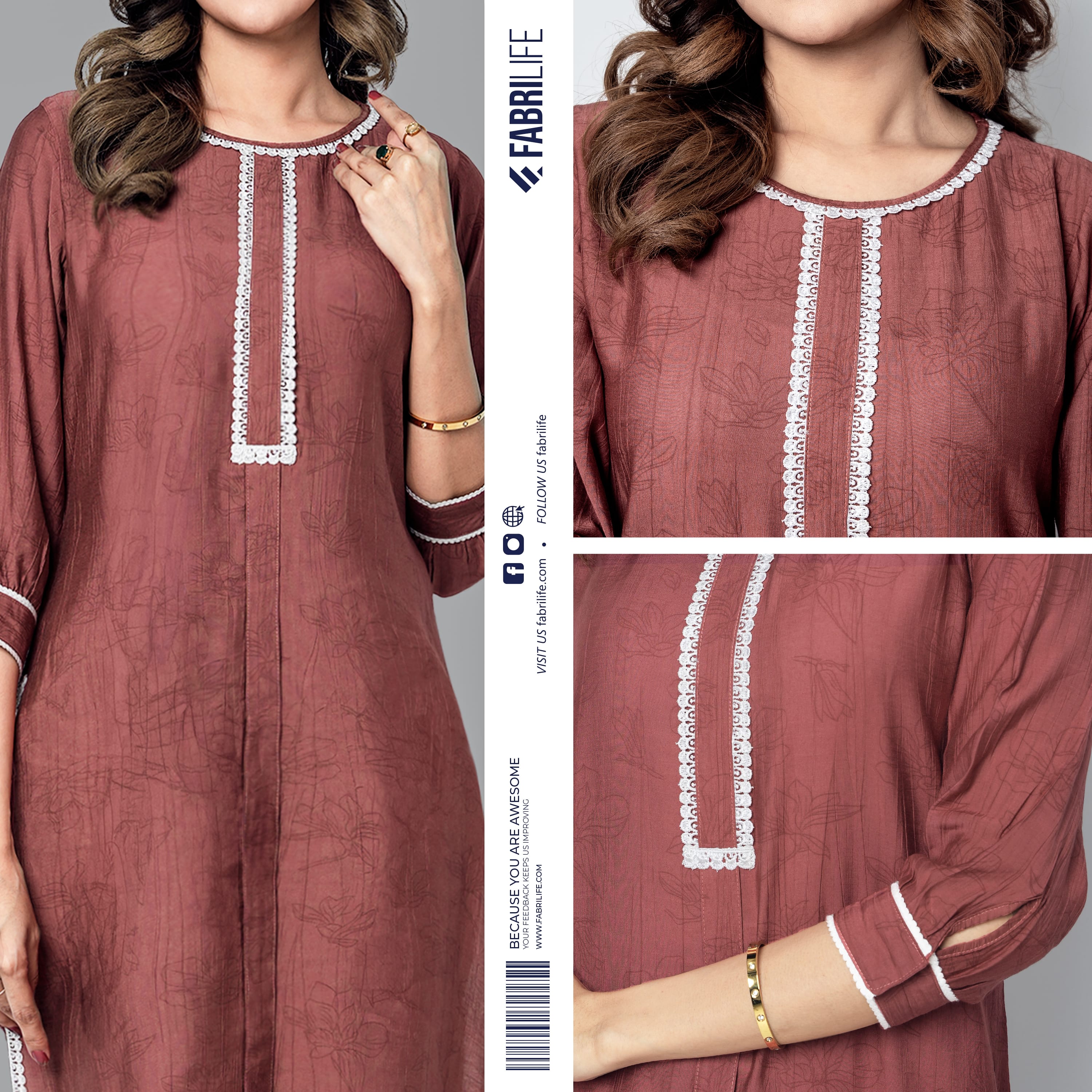 Where tradition meets elegance. The Lailati Kurti is crafted from a rich blend of 80% Cotton and 20% Silk, designed to deliver a soft, breathable feel with a subtle sheen. The fancy print design paired with exquisite lacework on the neckline, chest, bottom, and sleeves exudes timeless femininity. With a balanced GSM of 110, it offers a perfect combination of comfort and structure for both everyday wear and special occasions.