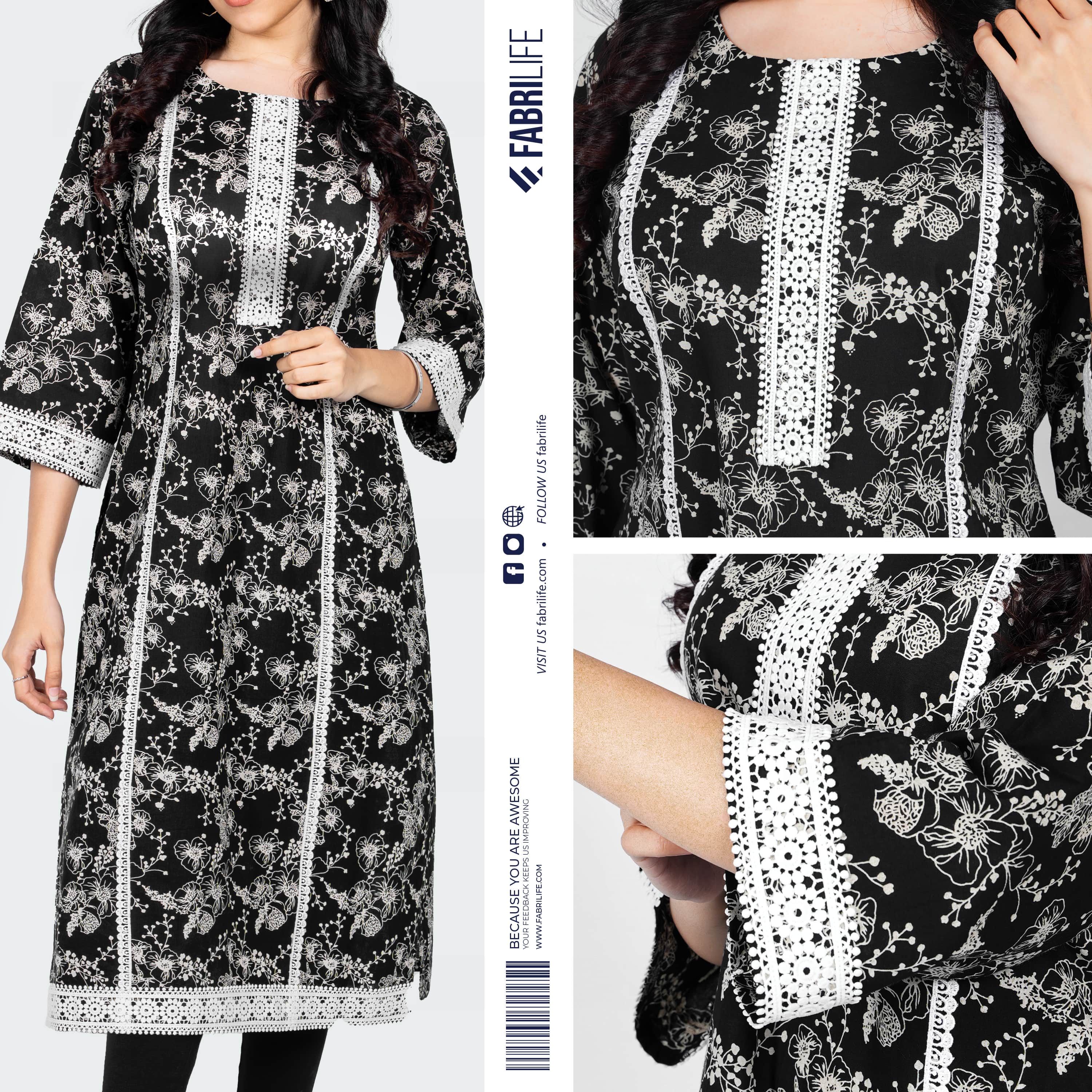 Experience timeless charm with our Night Tulip Kurti, crafted from premium 100% cotton fabric for all-day comfort. This piece features elegant lace detailing on the sleeves and body, enriched with subtle design aesthetics that elevate everyday wear into effortless style. It is ideal for modern women who value softness, breathability, and classic black tones in their wardrobe.